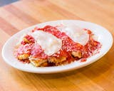 Marinara sauce, chicken, four cheese combination, parmesan cheese.