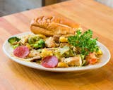 Curly pasta sauteed in garlic butter sauce with onions, chicken, sausage, pepperoni, mushrooms, broccoli & sprinkled with parmesan cheese on top & with love.